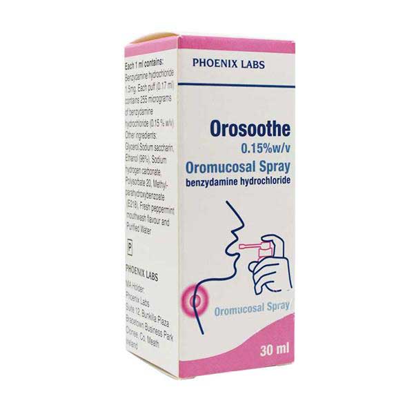 OroSoothe Spray is a non‐steroidal anti‐inflammatory drug (NSAID). It works by stopping pain and swelling (inflammation). It is used to treat painful conditions affecting the throat or mouth including: Sore throat, Sore tongue or gums, Mouth ulcers and discomfort caused by dentures or after dental work. OroSoothe contains the active ingredient Benzydamine. Available in a